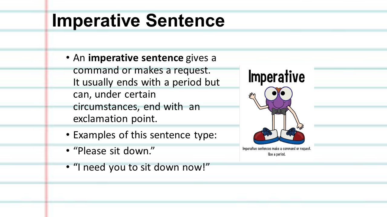 The sentence which is used to convey a command, a request, or a forbiddance is called an imperative sentence.this type of sentence always takes the second person (you) for the subject but most of the time the subject remains hidden. Imperative sentences exercise 4 do try it. You should use interrogative sentences to hook readers and create depth to your story. Requested, order, advised, forbade, suggested) replace the verbs (e.g. Said, told) of reporting verb.
